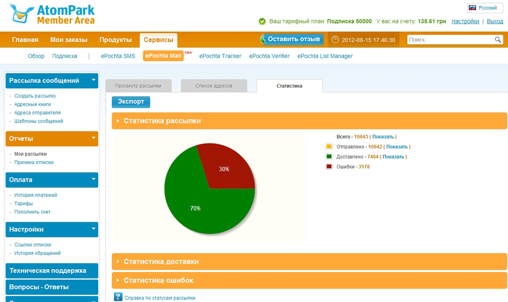 C ePochta Mail Service массовые рассылки не заканчиваются на этапе отправки email сообщений. После завершения доставки запускается сбор статистики как непосредственно в личном аккаунте сервиса, так и в дополнительно подключенных узкоспециализированных сервисах ePochta Tracker и Google Analytics. Собранная статистика отображается в понятных пользователю графиках и дает возможность не только выявить ошибки доставки, если таковые имеются, но и оптимизировать будущие email кампании на их основе.