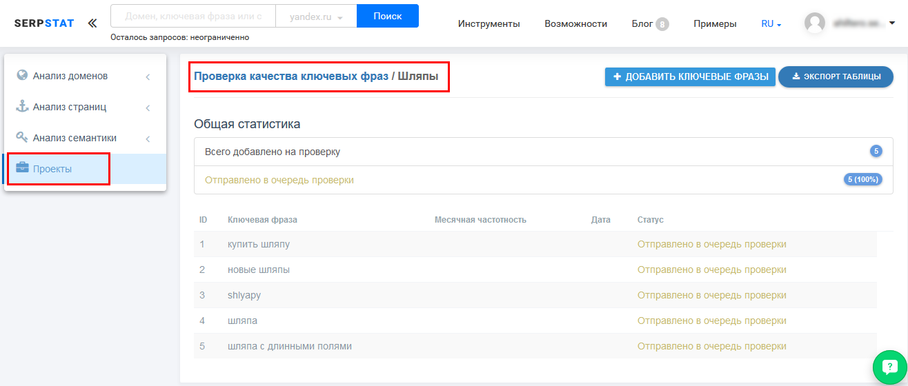 Через некоторое время (от 30 минут до часа) результаты проверки будут отображаться в разделе “Проекты”. Удаляем мусорные запросы, заменяем их более качественными ключевыми словами, и получаем сбалансированное семантическое ядро. Это дает нам дополнительный трафик по ЦА.