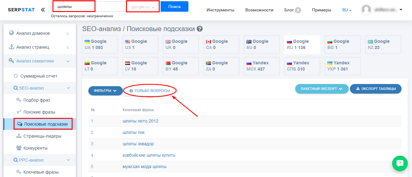 Для комплексного анализа поисковых подсказок, используем сервис Serpstat.