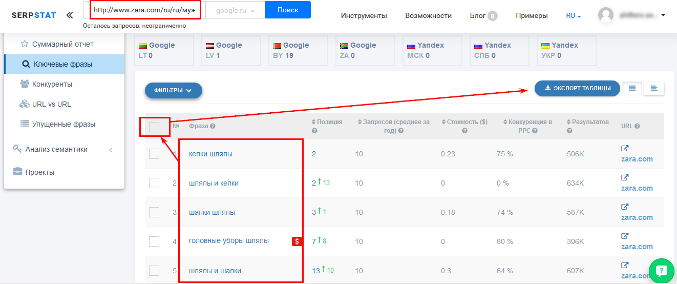 В том случае, когда семантика собирается с нуля, или предстоит ее серьезное расширение, используем раздел “Подбор фраз”. Экспортируем всю таблицу, или отдельно взятые ключевые фразы, и наполняем семантику.