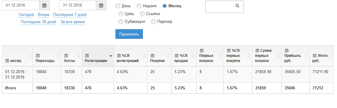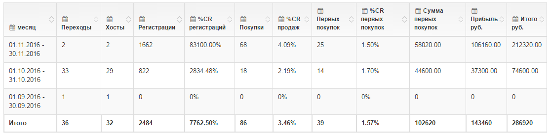 На скрине указана стата за 3 месяца 2016 года. Мы видим, что партнер начал лить в октябре и уже в ноябре вышел на приемлемые показатели.