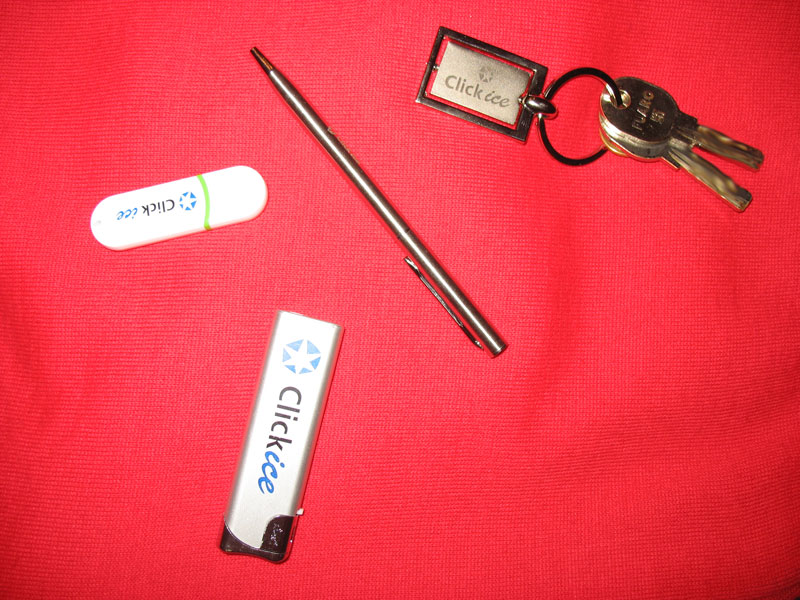 Вот какая хорошая партнерская программа Сlick ICE - прислали мне просто так ручшу, флешку на 4 гига, брелок и зажигалку. Все нужные вещи. Ручка удобная, стильная, в куртке хорошо лежит, девочкам записки удобно писать, зажигалка всегда нужная вещь, подкурить если надо, флешка лишней не бывает, а старый брелок давно надо было поменять. Теперь наслаждаюсь.