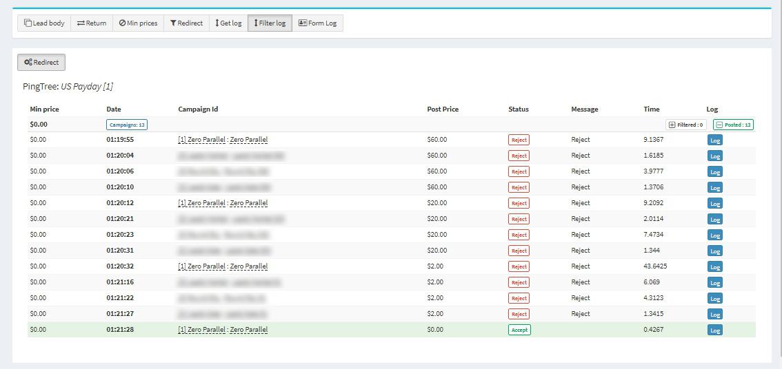 Open Market дает возможность отправлять лиды с минимальной ценой по очереди во все payday loans партнерки, в которых я зарегистрирован. То есть устанавливаем минимальную стоимость, например, $60 и посылаем данные поочередно в первую, вторую, … четвертую и т.д. партнерки. Если никто не купил, снижаем цену и снова проделываем те же манипуляции. Цепочку, порядок, количество покупателей и величину ценника можно регулировать самостоятельно. Лиды плохого качества, которыми никто не заинтересовался, Zero Parallel выкупает за $0,4. Это выглядит так: