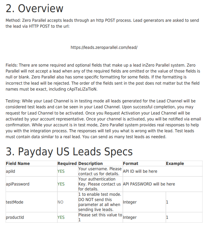 - Получить API инструкции у всех этих партнерок, чтобы передавать данные лида напрямую на нужный сервер. Я поговорил с менеджерами и мне открыли к ним доступ. Вот пример API инструкции Zero Parallel: