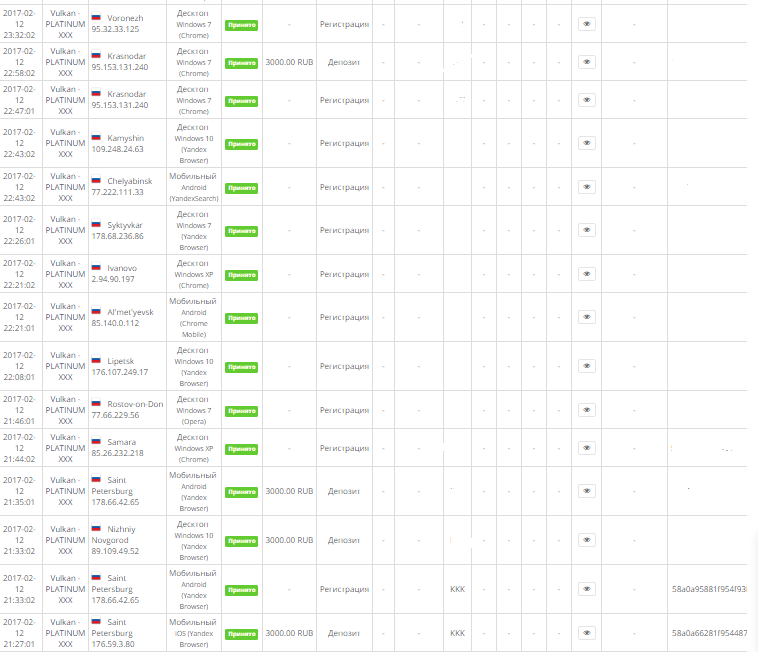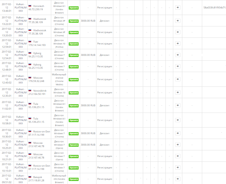 - Детальная статистика, есть выборки по конверсиям регистрации/депозиты, офферам, браузерам, городам, странам, ОС, устройствам и т.д.