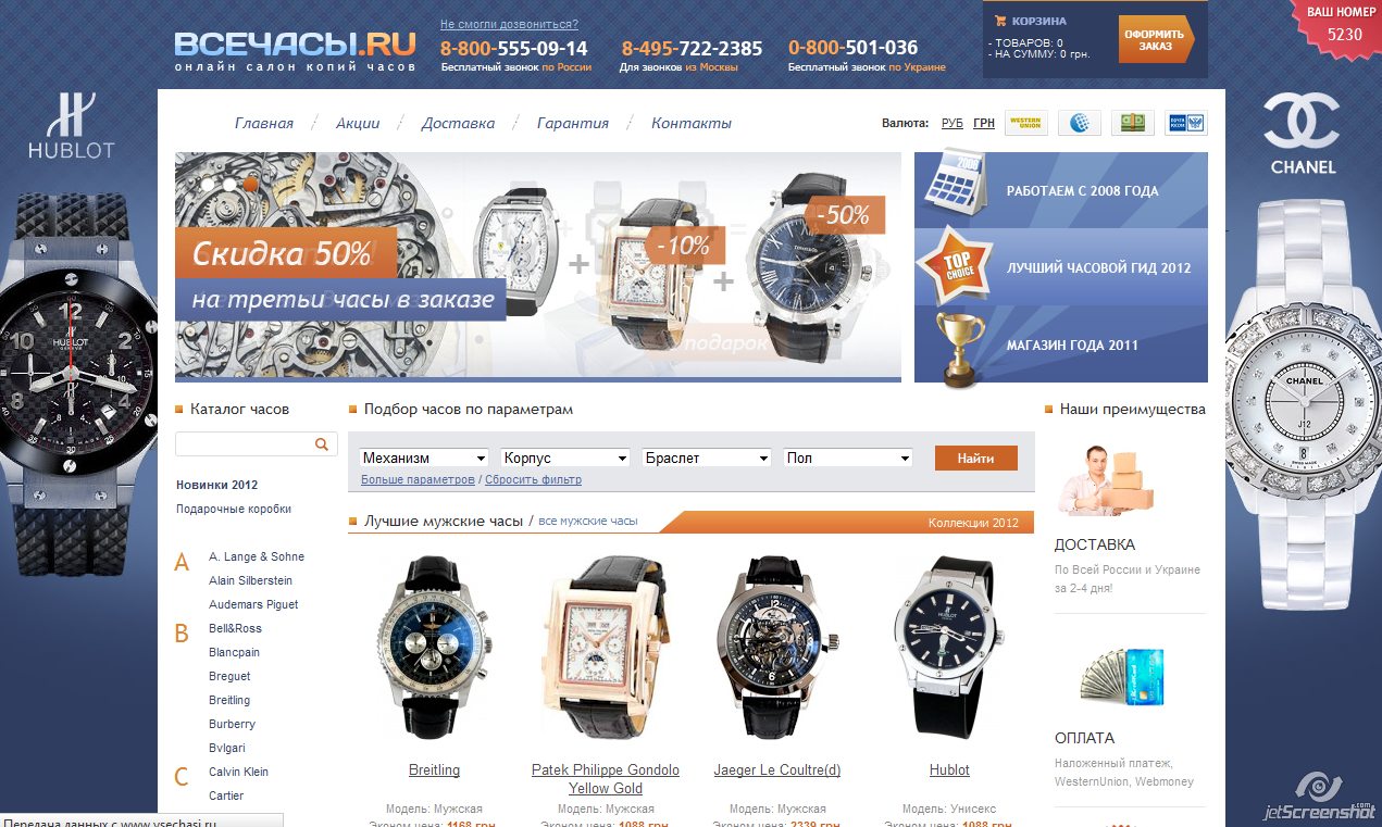 - дизайн магазина разрабатывался учитывая плюсы и минусы прошлых магазинов, а также ТОПовых магазинов по продаже часов в Интернете