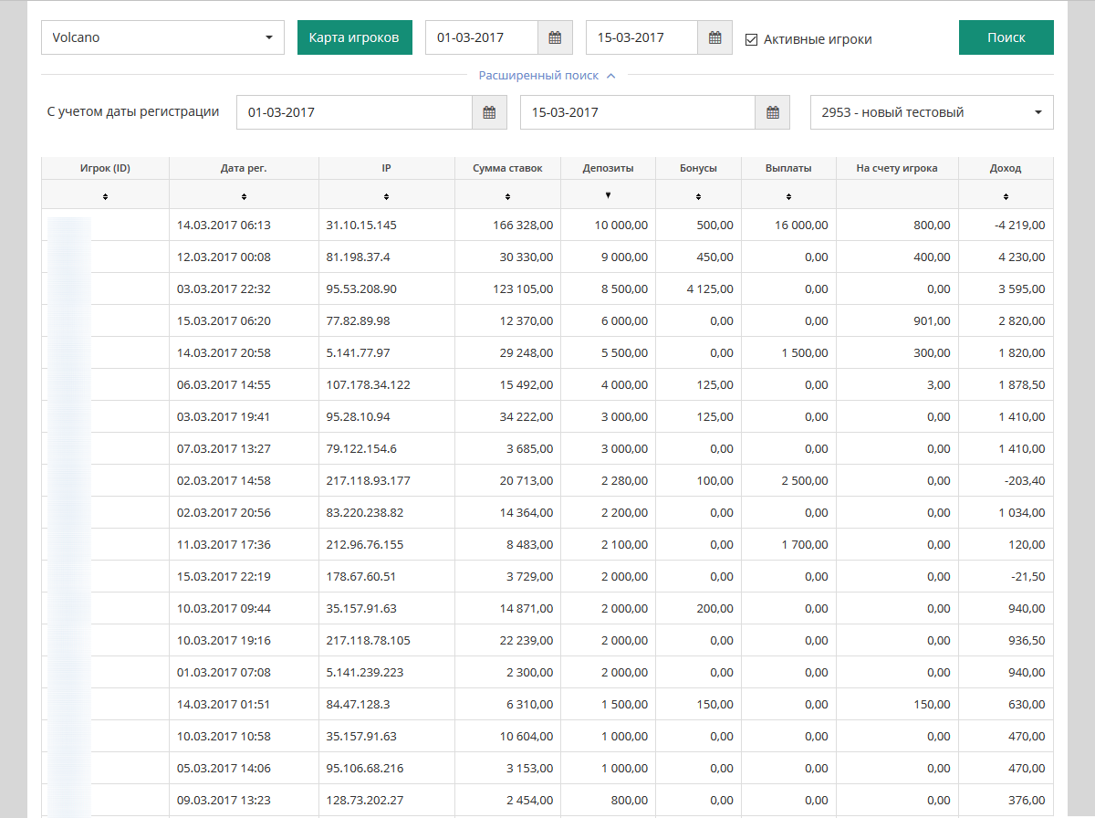 Выборка данных 1.03.2017-15.03.2017. Тематический сайт об азартных играх, посещаемостью около 500 человек в день, 70% РУ. Данные отсортированы по столбцу, показывающему сумму депозитов игрока за период (от большего к меньшему). Обратите внимание, что некоторые игроки могли быть зарегистрированы в начале, а некоторые в конце периода выборки статистики.