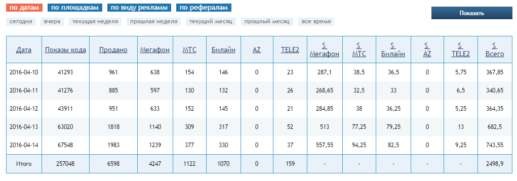 Все очень просто. После регистрации добавляете Ваш сайт в систему, генерируете для нее код (редирект или кликандер) и все - ждете денег 🙂 В систему принимаются русскоязычные сайты, размещенные на платном хостинге, с трафиком от 300 уникальных посетителей в сутки из поисковых систем. Админка достаточно простая и удобная.