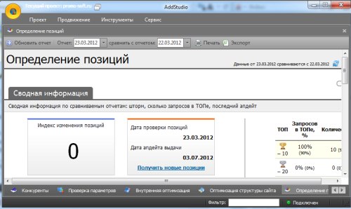 Это отличный SEO-комбайн для продвижения сайта. С помощью него легко можно провести SEO аудит сайта, подобрать ключевые слова, определить релевантные страницы, оценить внутреннюю оптимизацию и получить рекомендации, оценить бюджет продвижения и даже закупить ссылки. Также удобно ежедневно мониторить позиции по заданным ключевым словам. В принципе, он включает в себя практически все инструменты для сеошника. Очень удобно, когда все это в одной программе. В то время как конкуренты (а именно, SeoMonitor и PagePromouter) не развиваются и отстали, AddStudio постоянно держит руку на пульсе.