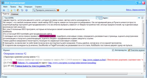 Часто приходится работать с контентом, а уникальность статей, как известно, является неотъемлемым атрибутом успешного продвижения сайта. Именно поэтому хорошая программа для проверки уникальности текста должна всегда быть под рукой у каждого, кто заказывает на биржах контента. eTXT Antiplagiat позволит проверить текст на плагиат за считанные секунды и не даст неуникальному материалу проникнуть на заполняемый сайт.