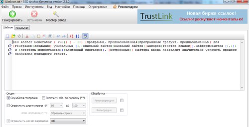 SEO Anchor Generator - программа для генерации текстов, анкоров и названий. Позволяет быстро и удобно генерировать множество текста по заранее определенному шаблону. Преимуществом десктопной версии является возможность работы с большими текстами. Также доступны дополнительные опции обработки текста, такие как поиск и удаление похожих текстов.