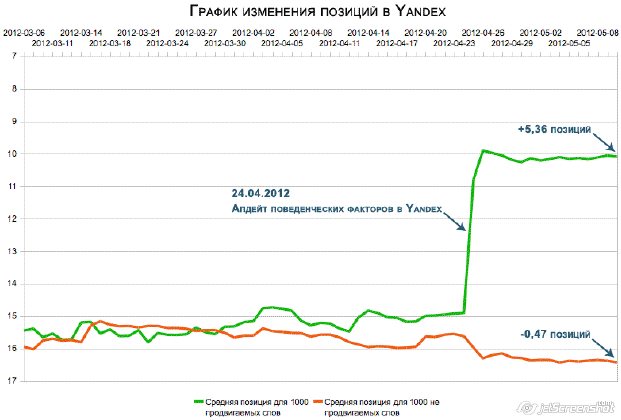 Основные изменения в позициях произошли после апдейта поведенческих факторов в Yandex 24.04.2012. Рост позиций по продвигаемым ключевым словам в Яндексе наблюдается по всем группам запросов: ВЧ +5,30; СЧ +5,29; НЧ +5,48; Геозависимые +5,01; ГеоНЕзависимые +5,71.