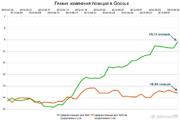 Рост позиций продвигаемых ключевых слов начался спустя 2 недели с начала продвижение и показывает устойчивый тренд. В отличии от Yandex'a позиции в Google растут достаточно плавно. Рост позиций по продвигаемым ключевым словам наблюдается по всем группам запросов: ВЧ +5,02; СЧ +5,16; НЧ +5,21; Россия +4,94; Украина +5,32. Интересный факт - вызвавший не малый переполох в среде СЕО оптимизаторов новый гугл-алгоритм «Пингвин», практически никак не сказался на трендах изменения позиций как для продвигаемых так и не для продвигаемых ключевых слов.